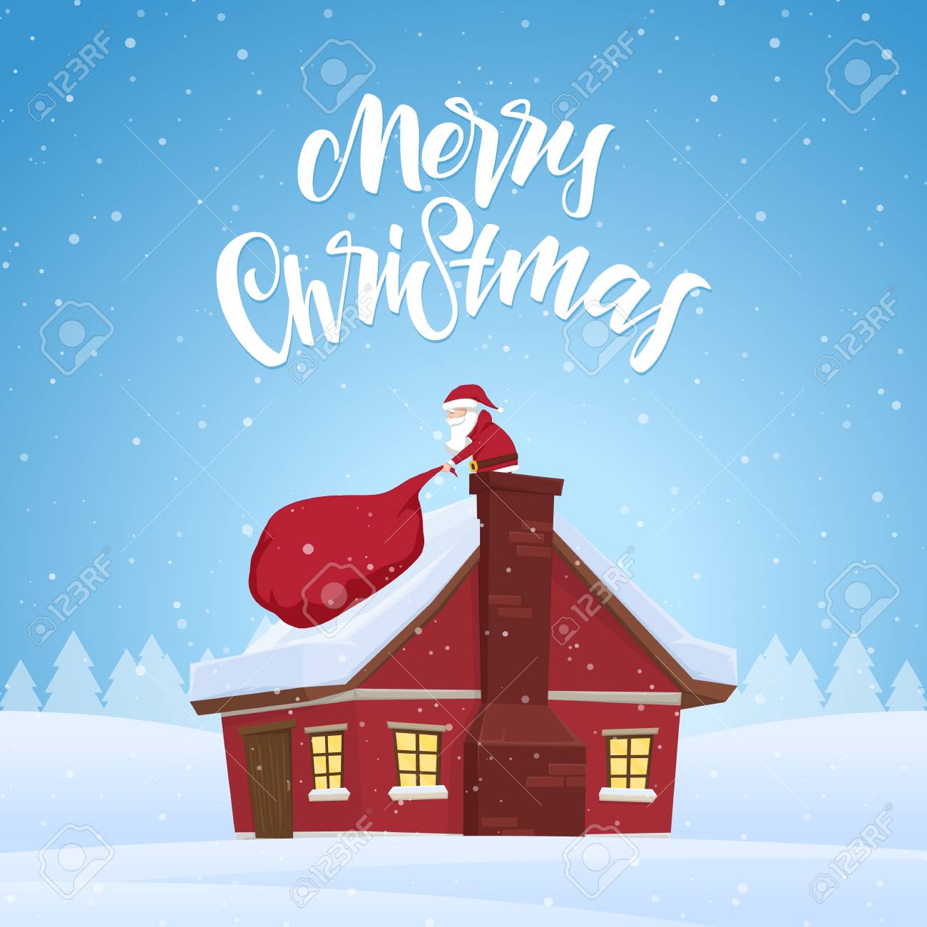 De Kerstman Trekt Een Zware Tas Vol Geschenken In Huis Cartoon Scene Handgeschreven Letters Van Merry Christmas Royalty Vrije Cliparts Vectoren En Stock Illustratie Image 94672600